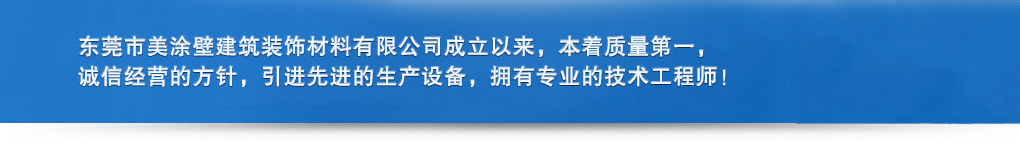 東莞市美涂壁建筑裝飾材料有限公司成立以來,本著質量第一,誠信經營的方針,引進先進的生產設備,擁有專業的技術工程師,通過全公司員工